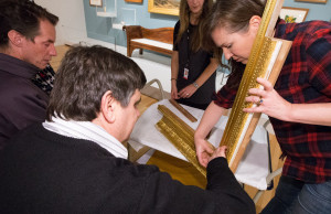 A member of the group is guided to explore by touch a large piece of ornate gilded picture framing.